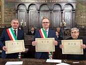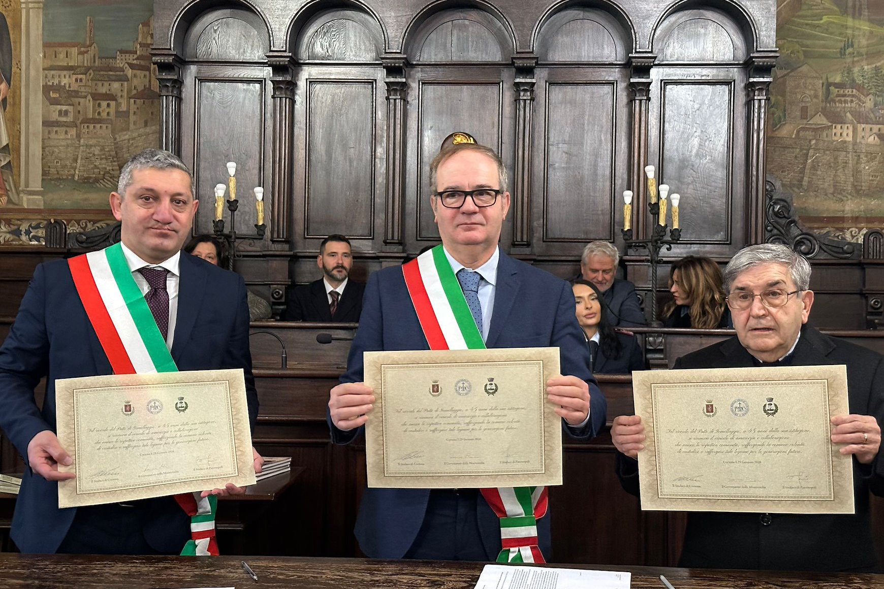 È stato celebrato nella sala del Consiglio comunale il 45^ anniversario del gemellaggio fra la città di Cortona e quella di Paternopoli. L’esperienza è nata dal contributo di aiuti portati dalla Misericordia a seguito del sisma che colpì il territorio irpino nel 1980. Quella del terremoto fu una vicenda drammatica durante la quale nacquero nuovi e forti legami fra le due comunità, grazie soprattutto al contributo umano e materiale portato dai volontari della Misericordia di Cortona a Paternopoli. Le vicende sono state ripercorse durante l’incontro istituzionale dal sindaco di Cortona Luciano Meoni, dal primo cittadino di Paternopoli, Beniamino Iorio, dal governatore della Misericordia Luciano Bernardini con un intervento anche del sindaco di allora, Ferruccio Fabilli. Presente come organizzatrice della mattinata, l’assessore alle Relazioni istituzionali, Silvia Spensierati.