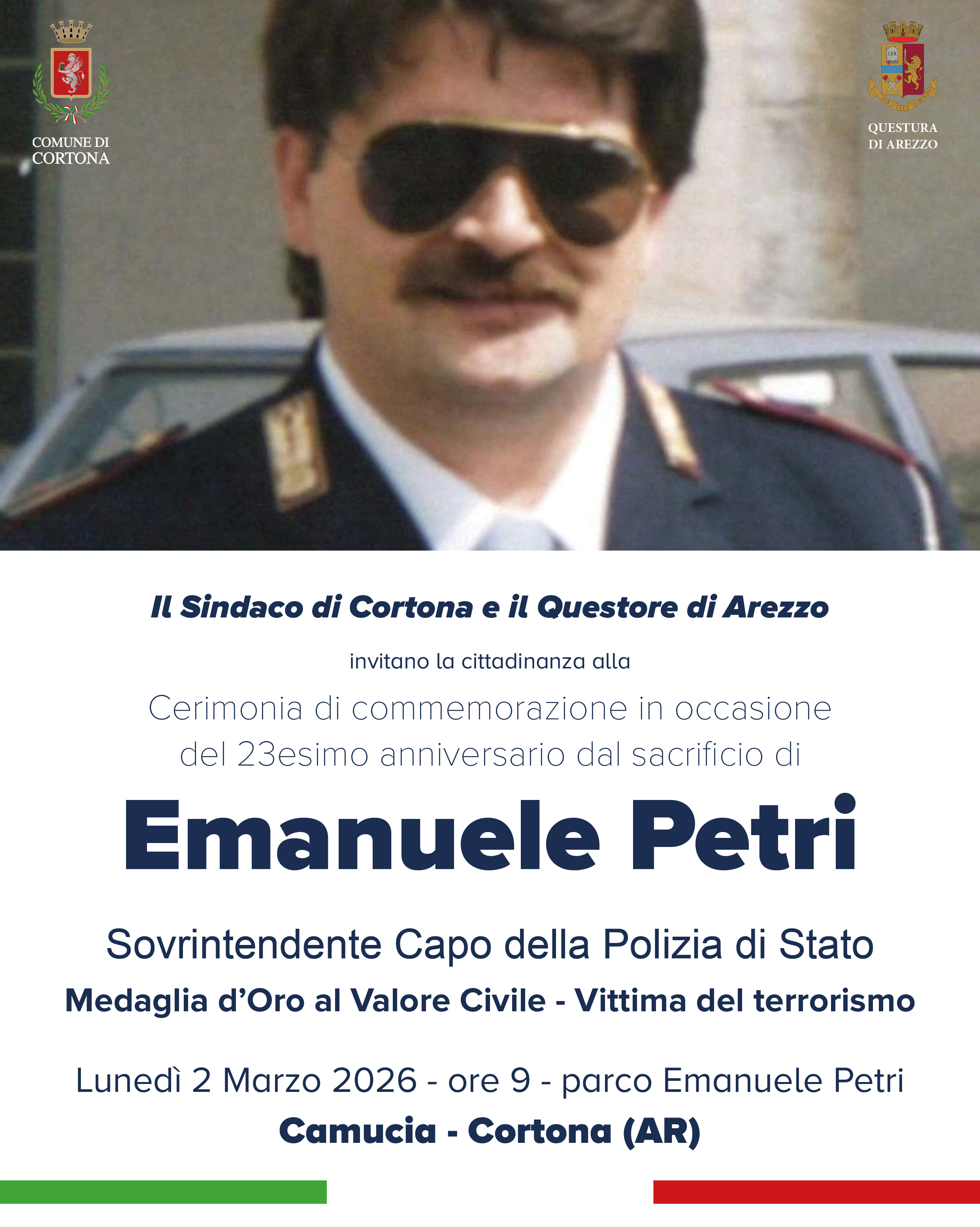 Dopo i saluti delle istituzioni coinvolte, Comune di Cortona, Prefettura e Questura di Arezzo, verrà deposta una corona al monumento dedicato al sovrintendente capo della Polizia di stato, medaglia d’oro al valor civile. Invitate tutte le associazioni locali, alla cerimonia collabora la Filarmonica cortonese per l’esecuzione dell’Inno d’Italia e del Silenzio d’ordinanza. «La nostra città ricorda con orgoglio la figura di Emanuele Petri - dichiara il sindaco Luciano Meoni - insieme a Petri omaggiamo tutti gli agenti della Polizia di stato che quotidianamente sono impegnati per la sicurezza pubblica. Non a caso nel 2021 abbiamo concesso la cittadinanza onoraria alla Polizia di stato e abbiamo intitolato il nuovo parco di Camucia ad Emanuele Petri. Da ricordare il contributo fondamentale dato da Petri e dai colleghi della Polfer di Terontola alle indagini contro le Nuove Brigate rosse, attraverso quell’ordinaria attività di controllo che gli costò la vita sul treno Roma-Firenze il 2 marzo del 2003. È anche grazie al lavoro quotidiano della Polizia di stato che è possibile combattere i grandi fenomeni criminali. Cortona non mancherà di rendere omaggio ad Emanuele Petri e, insieme a lui, a tutti gli agenti».