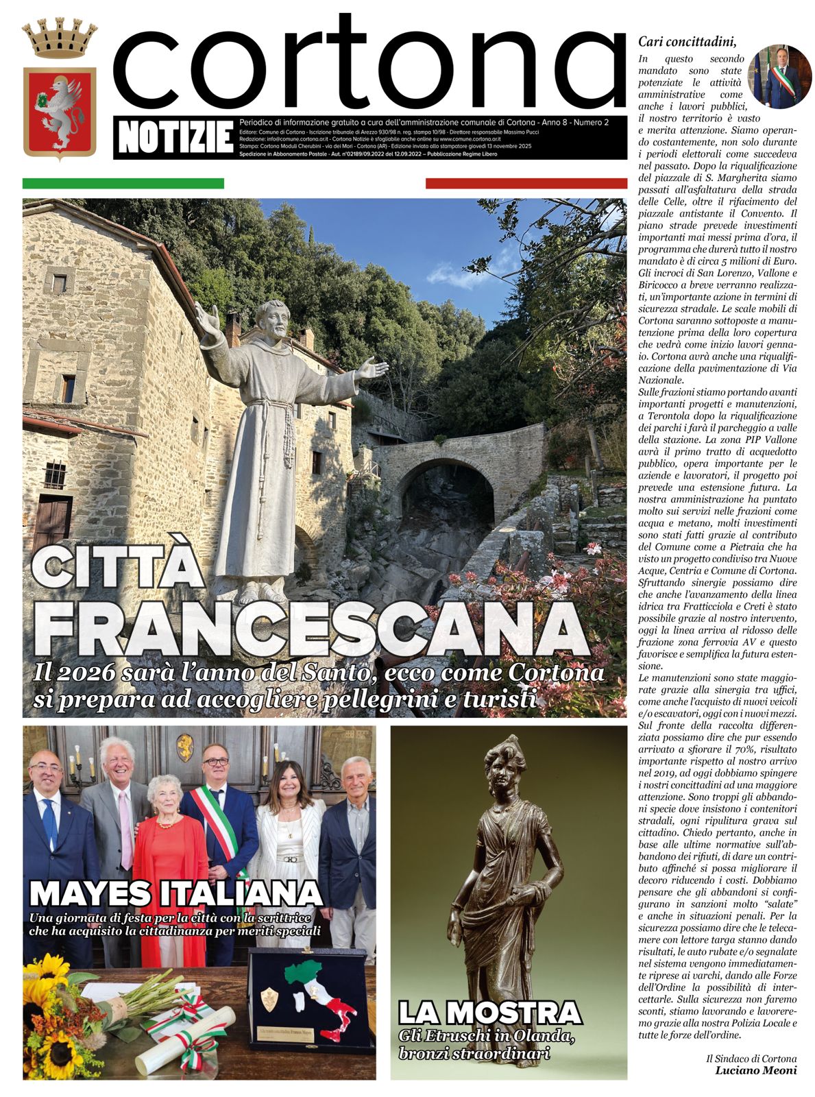 È uscito il nuovo numero del periodico d’informazione comunale Cortona Notizie. In questi giorni il giornale di informazione viene recapitato nelle case dei cortonesi. Dodici pagine dedicate ai lavori conclusi, ai progetti in corso e agli investimenti strategici con in primo piano le iniziative legate all’Anno Francescano. Le opere pubbliche realizzate e il programma di eventi che saranno sviluppati nel corso del 2026.
