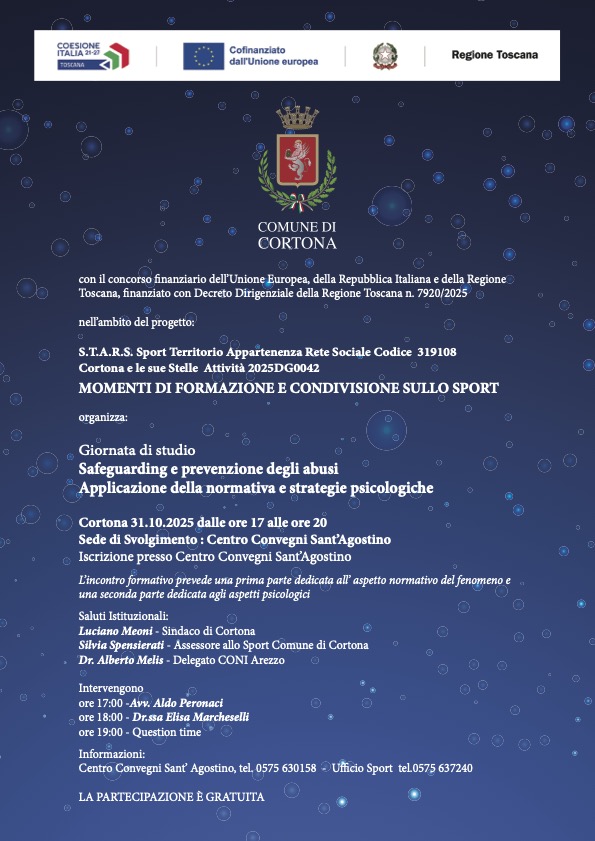 Indicazioni e consigli per la tutela dei minori e delle fragilità. È questo l’obiettivo dell’incontro che si svolgerà il prossimo 31 ottobre a Cortona, dedicato agli addetti ai lavori del mondo sportivo e aperto alla cittadinanza. Nell’ambito del progetto Stars – Sport Territorio Appartenenza Rete Sociale (Codice 319108), finanziato con il concorso dell’Unione Europea, della Repubblica Italiana e della Regione Toscana – con Decreto Dirigenziale della Regione Toscana n. 7920/2025 – si svolgerà a Cortona, al Centro Convegni Sant’Agostino, la giornata di studio intitolata “Safeguarding e prevenzione degli abusi – Applicazione della normativa e strategie psicologiche”.