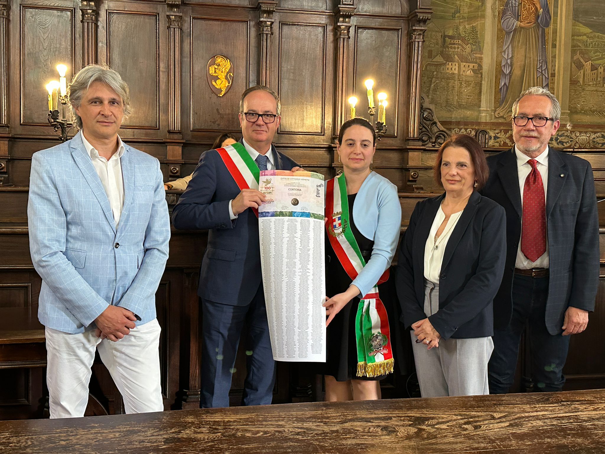 Alla cerimonia di inaugurazione sono intervenuti anche Sergio Angori, conservatore bibliografico dell’Accademia Etrusca, Nicola Caldarone, presidente del Comitato tecnico del Maec e i curatori Mario Parigi e Patrizia Rocchini. Prima del taglio del nastro l’assessora De Nardi ha consegnato al sindaco Meoni la pergamena con i nomi dei combattenti cortonesi della Grande guerra. Il Comune di Vittorio Veneto ha concesso loro e a tutti i militari impegnati al fronte, la cittadinanza onoraria.