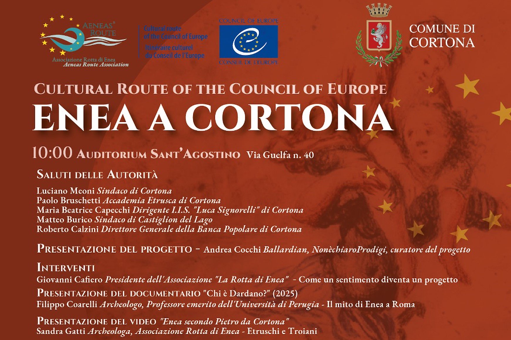 La giornata dedicata a Enea a Cortona si aprirà con i saluti del sindaco Luciano Meoni e altri interventi istituzionali. Interverranno tra gli altri Giovanni Cafiero presidente dell’Associazione Rotta di Enea, gli archeologi Filippo Coarelli su Il Mito di Enea a Roma e Sandra Gatti su Etruschi e Troiani. Seguiranno un reading teatrale a cura del Liceo artistico Luca Signorelli, un documentario su Dardano, un video su Enea ritratto da Pietro da Cortona negli affreschi di Palazzo Pamphili a Roma. Conclude i lavori Paolo Giulierini, dirigente area amministrativa e cultura del Comune di Cortona, già direttore del Museo Archeologico Nazionale di Napoli.
