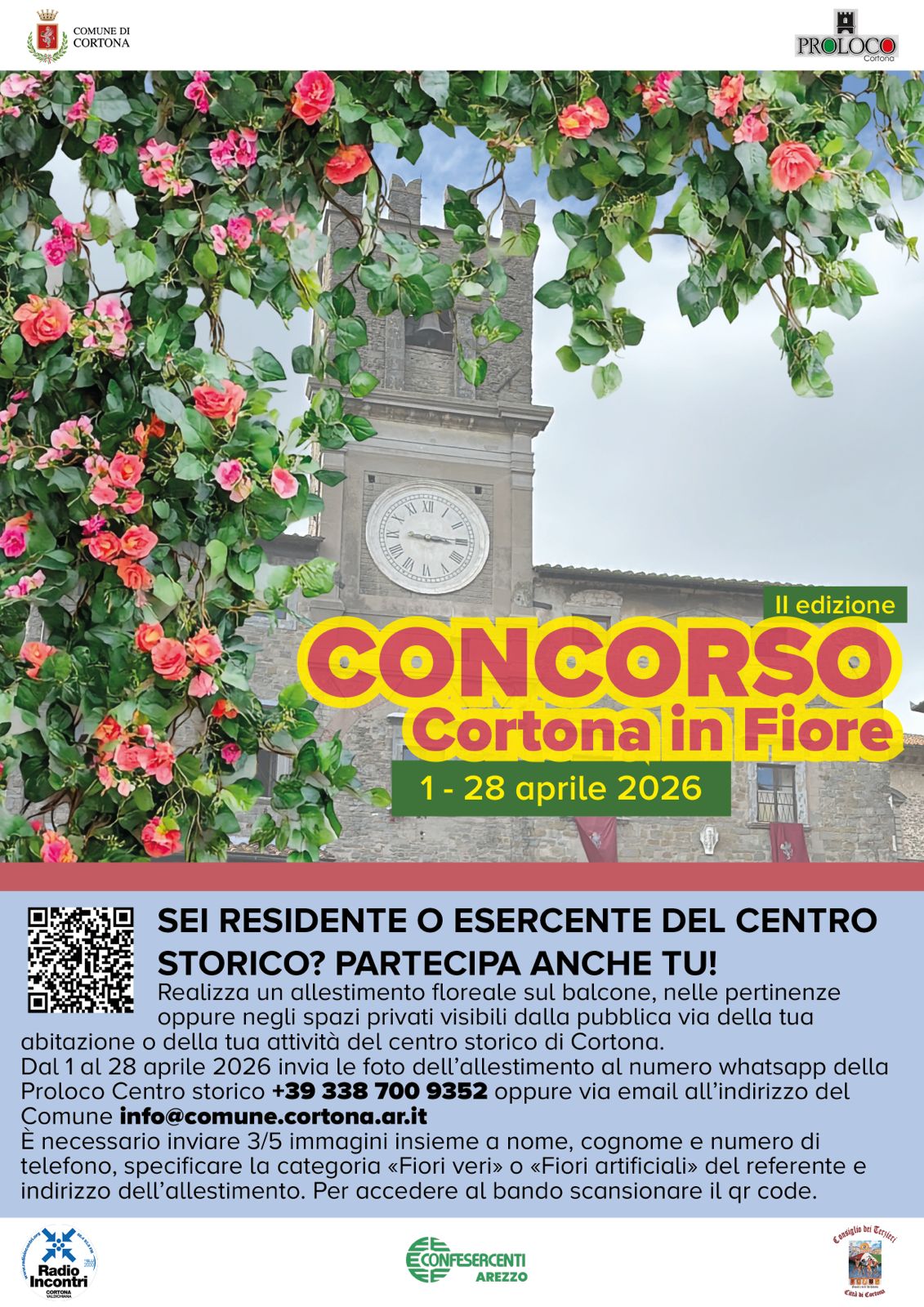 È in partenza la seconda edizione del «Concorso Cortona in Fiore», dal primo fino al 28 aprile è possibile inviare le fotografie degli allestimenti floreali realizzati su abitazioni e attività produttive del centro storico. L’iniziativa è promossa dall’Amministrazione comunale con la collaborazione di Confesercenti, Proloco centro storico, Consiglio de Terzieri e Radio Incontri.