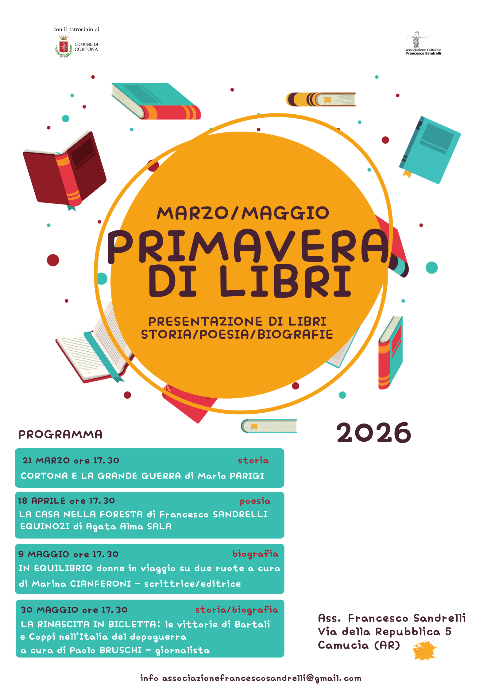 L’associazione «Francesco Sandrelli» con il patrocinio dell’Amministrazione comunale, organizza un ciclo di incontri dedicati alla lettura. L’iniziativa si intitola «Primavera di libri» e verrà inaugurata questo sabato 21 marzo alle 17,30 nella sede dell’Associazione in via della Repubblica 5, a Camucia.