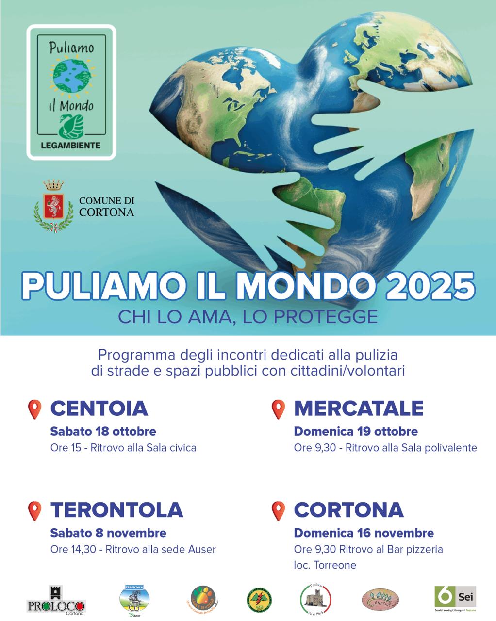 Le quattro iniziative vedono la collaborazione delle associazioni locali Proloco Cortona centro storico, Auser Terontola, Proloco Val di Pierle, Proloco Centoia, Vab Cortona ed Etruria animals defendly. A tutti coloro che decideranno di partecipare a «Puliamo il mondo» sarà consegnata la pettorina e il kit per la raccolta dei rifiuti.