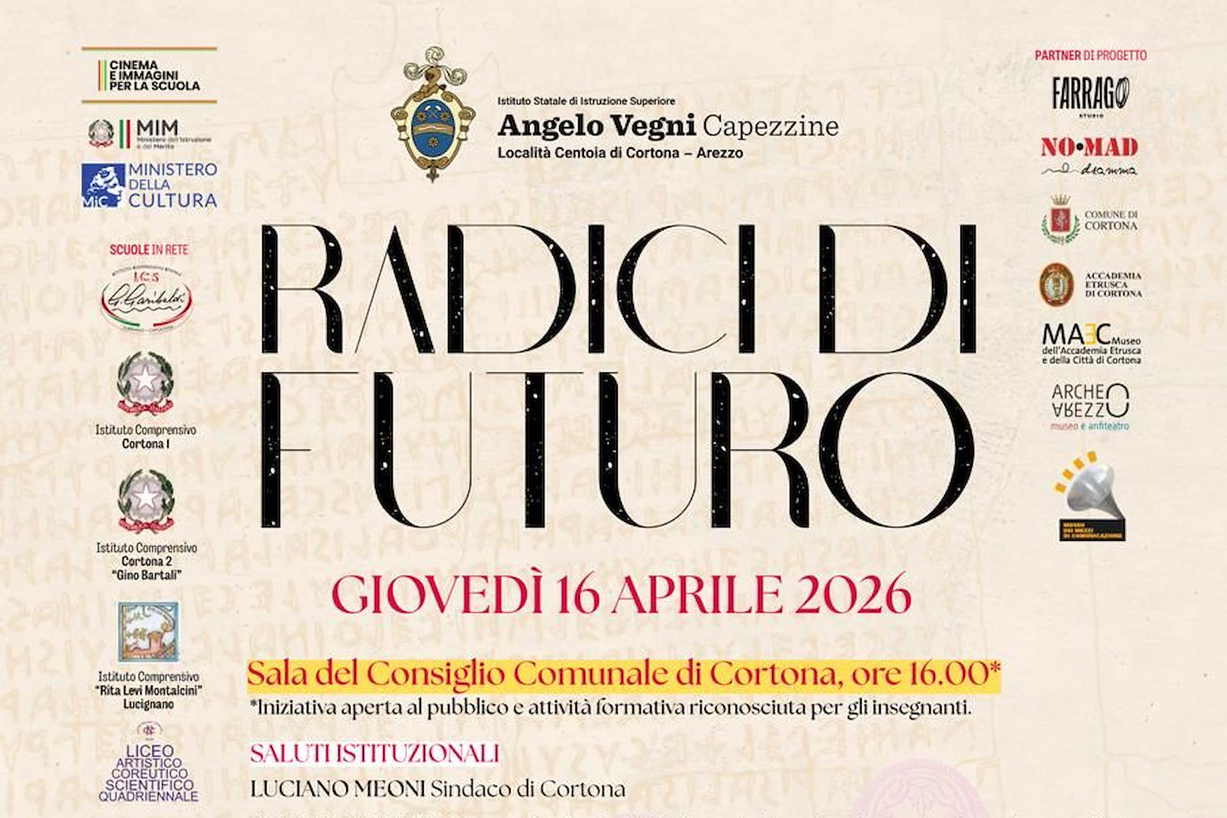 Giovedì 16 aprile prossimo si svolgeranno a Cortona le iniziative principali collegate al progetto "Radici di Futuro", finalizzato ad avvicinare le giovani generazioni alle nostre radici etrusche e organizzato da una rete di scuole capitanata dall'Istituto Vegni delle Capezzine con il sostegno del Ministero dell'Istruzione e del Merito e del Ministero della Cultura.