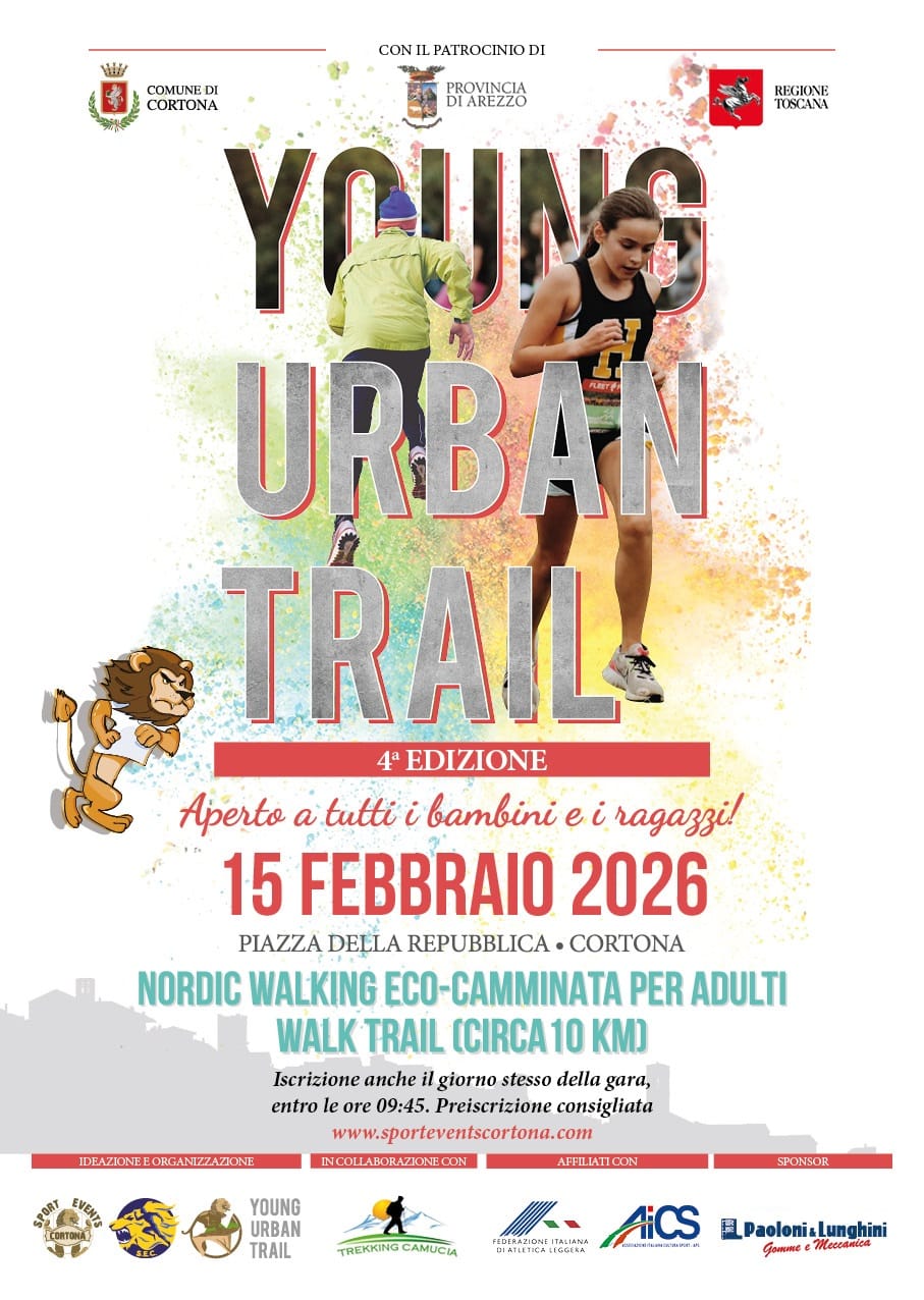 È in arrivo la quarta edizione di «Young Urban Trail», la manifestazione sportiva dedicata ai giovanissimi che si abbina alla eco-camminata «nordic walking» di 10 km. Prima parte della mattinata dedicata agli adulti, con la partenza alle ore 9 da piazza della Repubblica della eco-camminata. Dalle ore 10 le piazze e le strade della città etrusca saranno tutte per i più giovani, con l’avvio delle registrazioni, per l’iscrizione è già possibile collegarsi a questo link: http://www.sporteventscortona.com/.