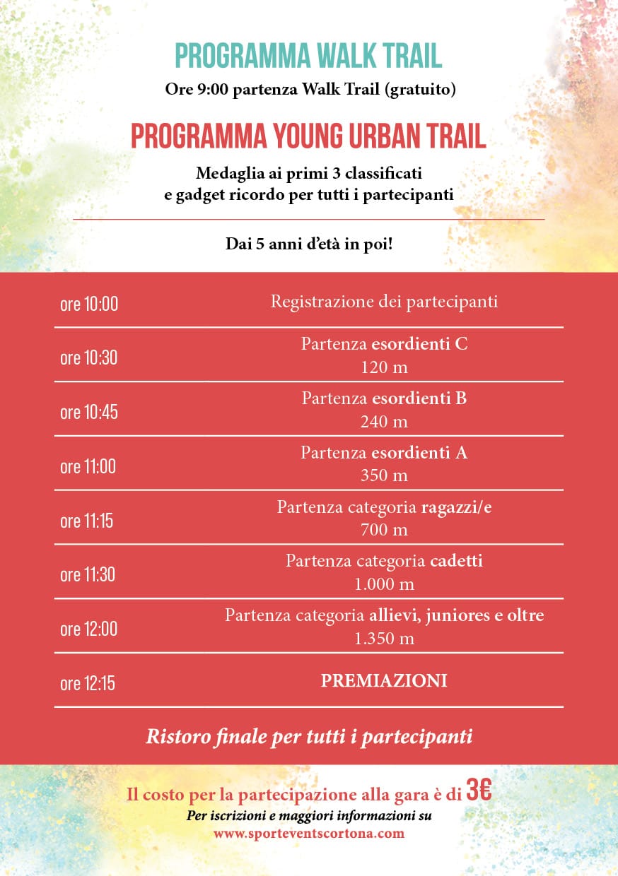 Young Urban Trail è organizzato dall’associazione «Sport Events Cortona» con il patrocinio dell’Amministrazione comunale, la collaborazione del Gruppo Trekking Camucia e il sostegno degli sponsor.