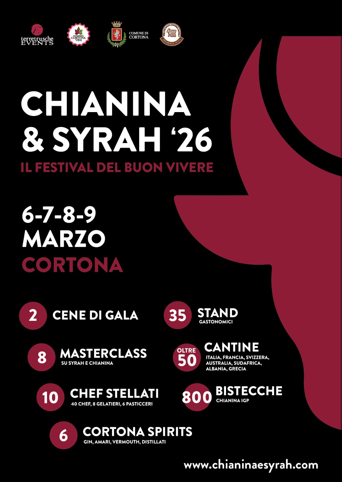 L’evento, ideato e organizzato da Terretrusche Events, voluto dal Consorzio Vini, sostenuto dal Comune di Cortona con la collaborazione di Cortona Sviluppo, la partnership della Banca Popolare di Cortona insieme ad altri sostenitori e con la tutela e la garanzia del Consorzio di Tutela del Vitellone Bianco dell’Appenino Centrale IGP, ha come obiettivo la valorizzazione delle due grandi eccellenze il Syrah e la Chianina e di presentare il «buon vivere» in Toscana, in una città come Cortona, già sede di tanti eventi di successo legati all’enogastronomia.