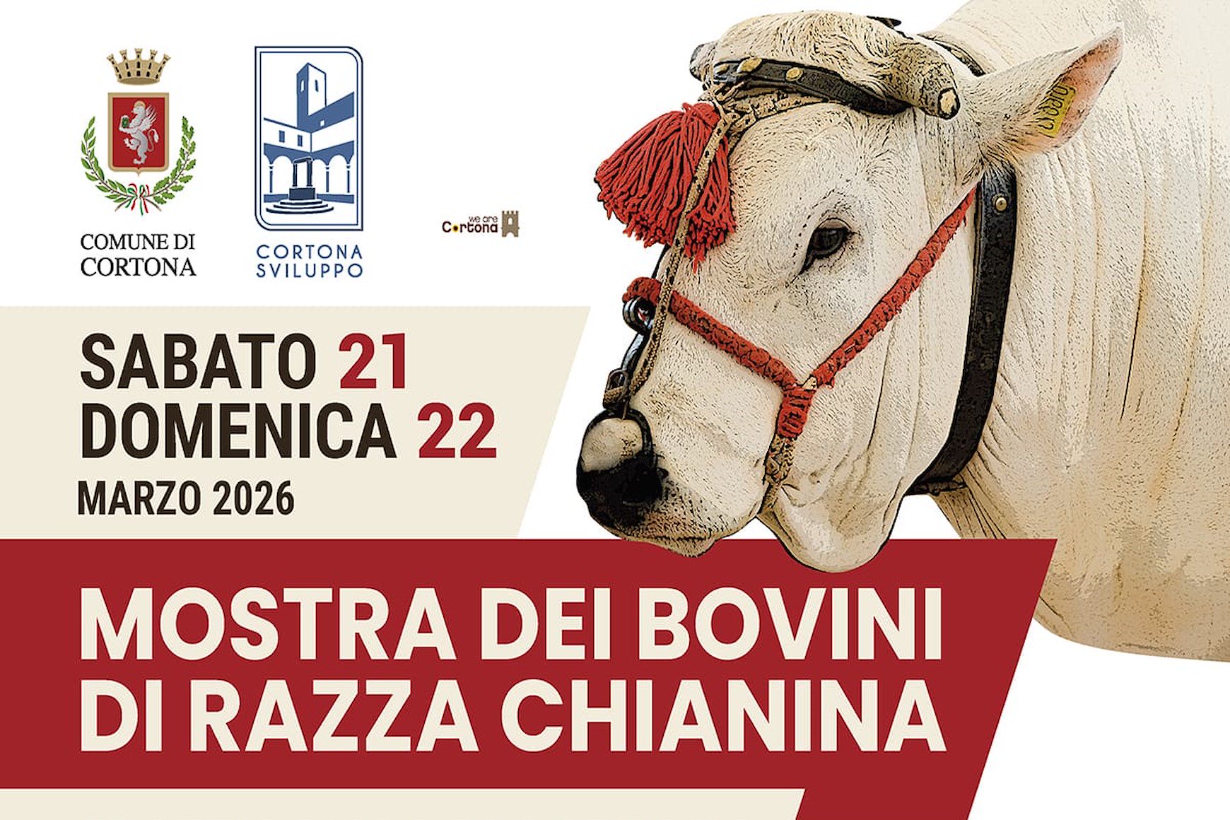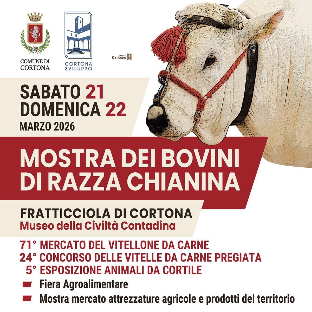 L’evento è promosso dal Comune di Cortona, con l’organizzazione di Cortona Sviluppo e dell’Associazione Il Carro, il sostegno della Banca Popolare di Cortona e la partecipazione di numerose realtà del territorio, tra cui il Consorzio di tutela Vitellone Bianco dell’Appennino Centrale Igp, l’Istituto di istruzione superiore “Angelo Vegni” delle Capezzine, il Consorzio Cortona Doc, l’Oleacademia Eleiva Cortonensis e tante realtà del mondo agricolo e gastronomico.