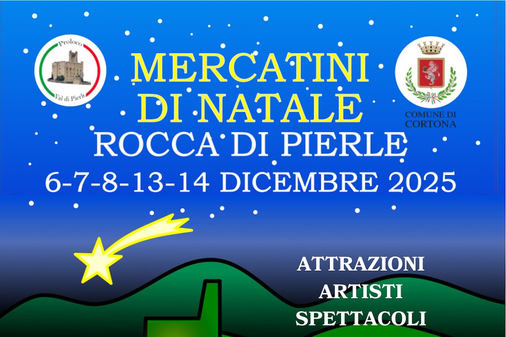 Cos'è? MERCATINI • Val di Pierle DI NATALE COMUNE DI CORTONA ROCCA DI PIERLE 6-7-8-13-14 DICEMBRE 2025 ATTRAZIONI ARTISTI SPETTACOLI STAND GASTRONOMICI SERVIZIO NAVETTA