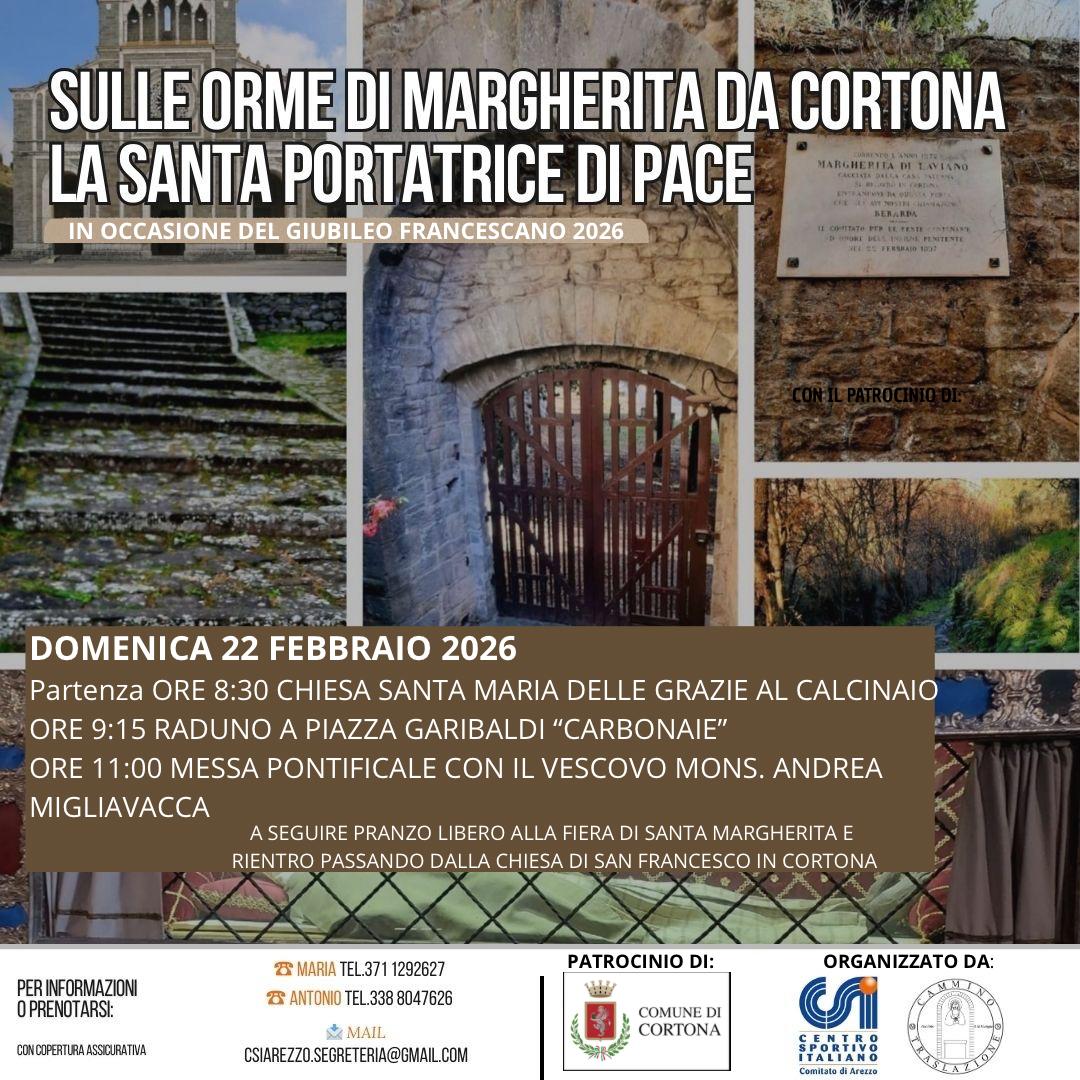 Domenica 22 febbraio si terrà a Cortona la passeggiata non competitiva “Sulle orme di Santa Margherita”, iniziativa promossa dal CSI Arezzo insieme all’associazione Il Cammino della Traslazione ASD e con il patrocinio del Comune di Cortona, nell’anno del Giubileo di San Francesco 2026.