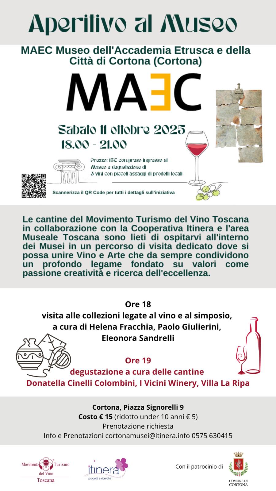 Ogni museo prevede una visita guidata agli spazi museali, seguita da una degustazione di vini delle cantine che saranno presenti con il produttore in abbinamento a prodotti tipici. Le cantine partecipanti avranno anche la possibilità di far conoscere e vendere le proprie bottiglie ai visitatori. I musei che apriranno le porte saranno il MUSMED di Livorno con la visita alle sale espositive e all’Orto Botanico, con particolare attenzione alla sezione dedicata ai fruttiferi antichi, sempre a Livorno il Museo della Città con visita alla collezione civica d’arte contemporanea con opere di Guttuso, Fontana, Burri e tanti altri protagonisti. Il Museo Civico Archeologico di Chianciano Terme offrirà una visita, della durata di circa un’ora, concentrate principalmente nelle sezioni legate alla produzione del vino e al simposio. Il MUBIA di Monterotondo Marittimo con visita alle collezioni museali alla scoperta della geotermia e del viaggio dalla scoperta dell’acido borico alla produzione di energia elettrica. Al Museo delle Miniere di Montecatini Val di Cecina si svilupperà un affascinante viaggio per conoscere le tecniche di estrazione e le storie dei minatori. Il Museo Civico Archeologico ‘Palazzo Bombardieri’ di Rosignano Marittimo con la visita alle collezioni museali con particolare attenzione al materiale relativo a Vada Volaterrana, l’antico porto etrusco poi romano. Il Maec di Cortona invece offrirà un approfondimento sulle sezioni archeologiche e sui materiali legati al simposio e al consumo di vino, come ad esempio la celeberrima tabula cortonensis. I programmi delle visite e degustazioni di Aperitivo al Museo sono pubblicati sul portale ufficiale www.mtvtoscana.com