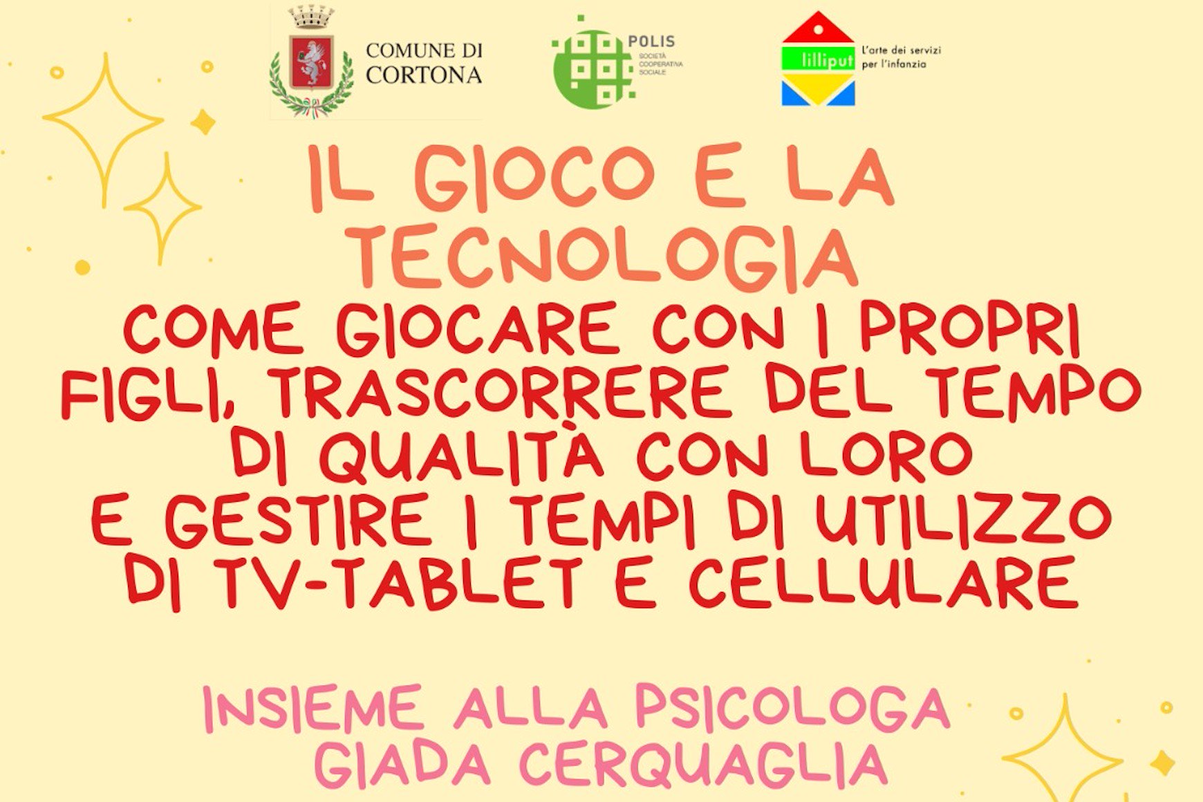 L'incontro condotto dalla psicologa Giada Cerquaglia, sarà incentrato sul gioco e la tecnologia, tema rilevante nell’ambito dell’educazione e nella gestione dell’utilizzo dei dispositivi digitali in famiglia. Sarà promossa una riflessione su come gestire i tempi di utilizzo di tv, tablet e cellulare con e per i bambini. L’aspetto è particolarmente complesso e di interesse generale per considerare abitudini, confrontarsi ed esporre dubbi e perplessità.