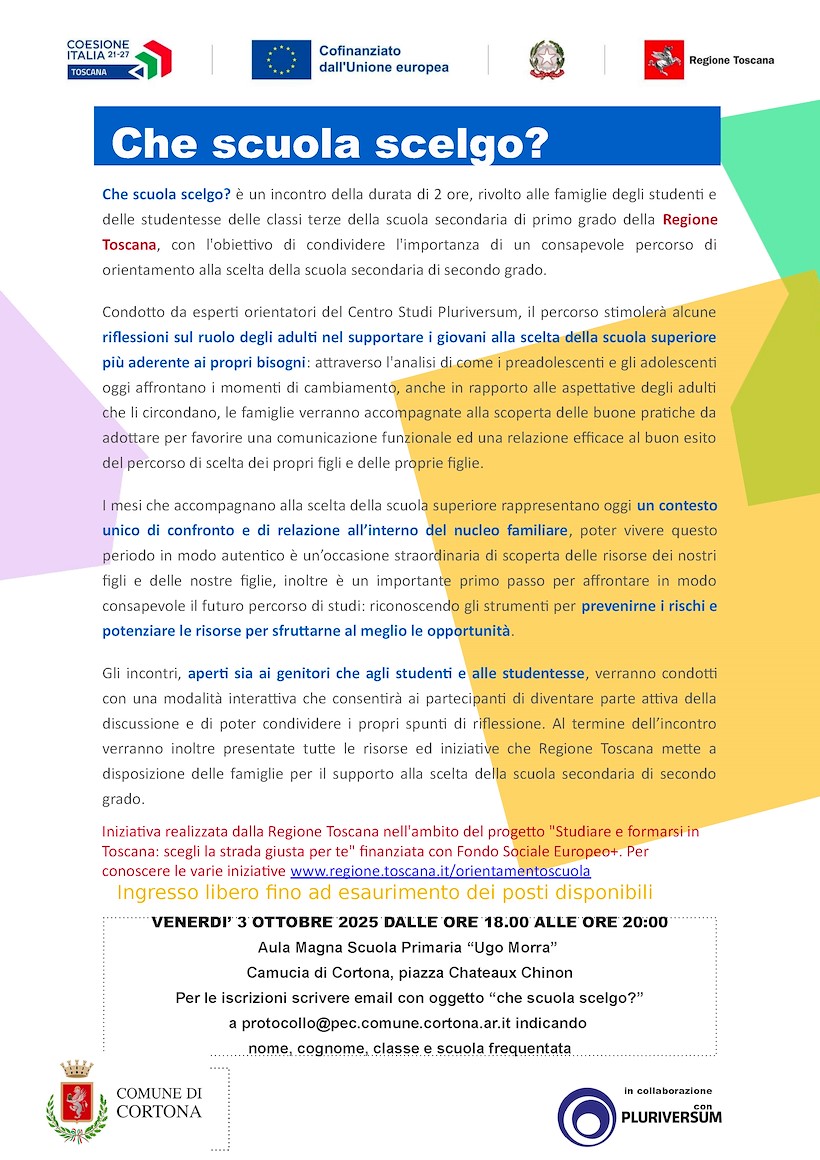 Appuntamento venerdì 3 ottobre ore 18 - Aula Magna Scuola Primaria “Morra” - Camucia di Cortona, piazza Chateaux Chinon. Per le iscrizioni scrivere email con oggetto “che scuola scelgo?” a protocollo@pec.comune.cortona.ar.it indicando nome, cognome, classe e scuola frequentata